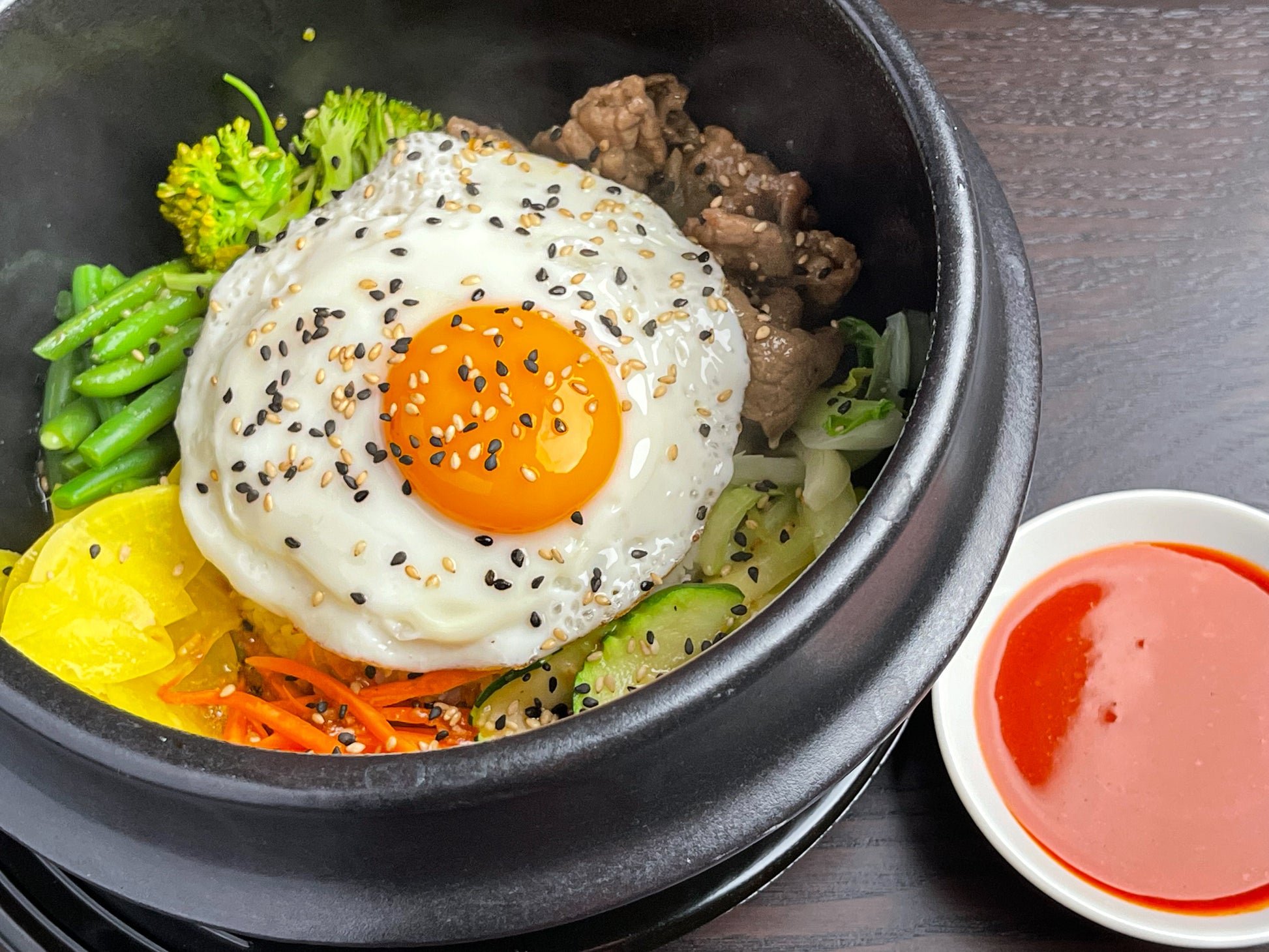 Koreas bunte Reis-Schüssel: Eine Basis aus warmem Reis, getoppt mit verschiedenen Gemüsesorten, Fleisch/Tofu (optional) und einem Spiegelei. Dazu gibt es die typische, würzige Chilipaste. Einfach alles gut durchmischen und genießen! Dazu gibt es eine kleine Portion Kimchi.