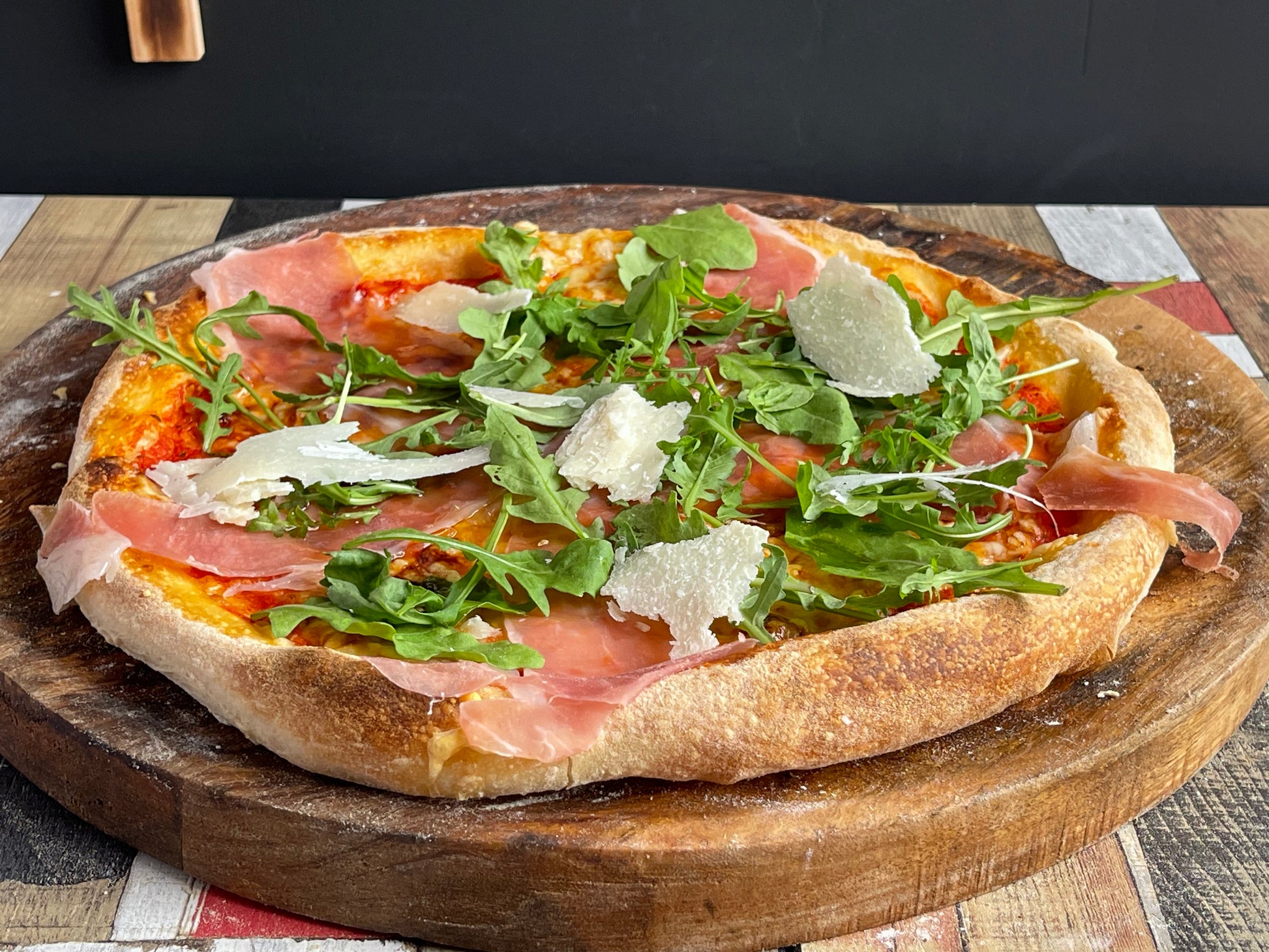 Prosciutto Crudo: Tomatensauce, Mozzarella, Parmaschinken, Rucola, Parmesan