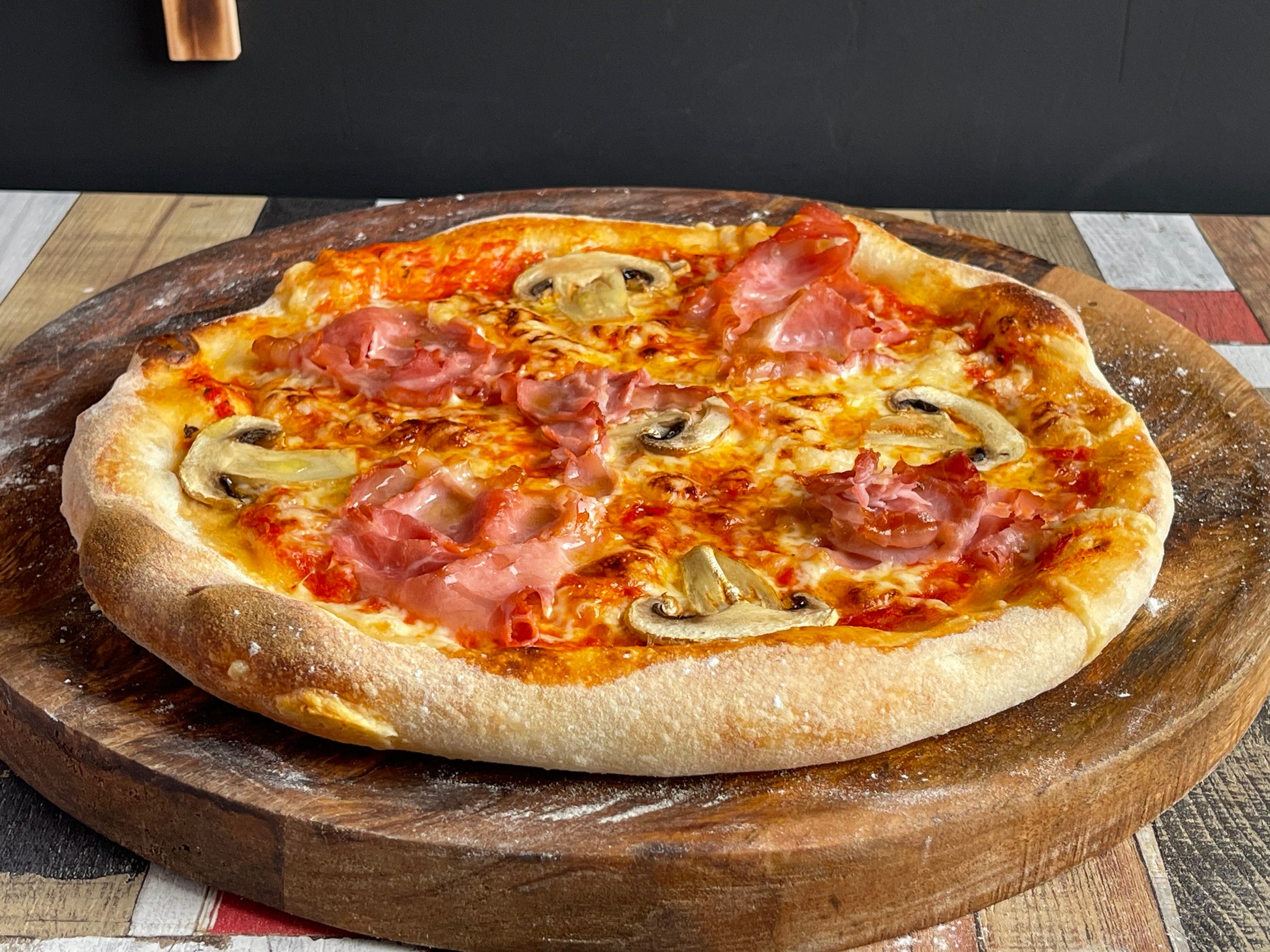 Prosciutto Funghi: Tomatensauce, Mozzarella, Schinken, Champignons